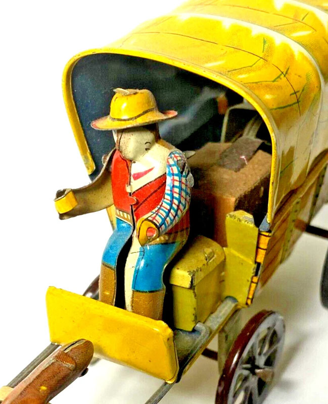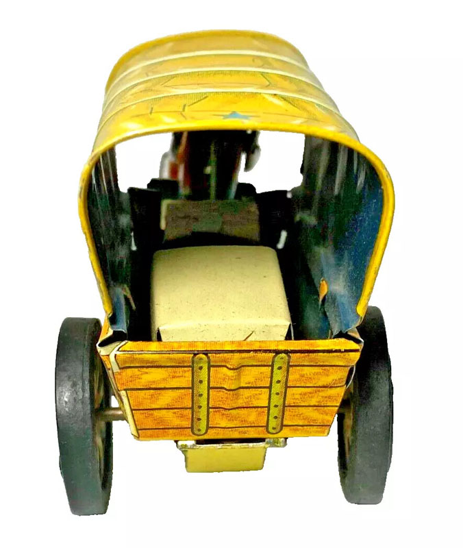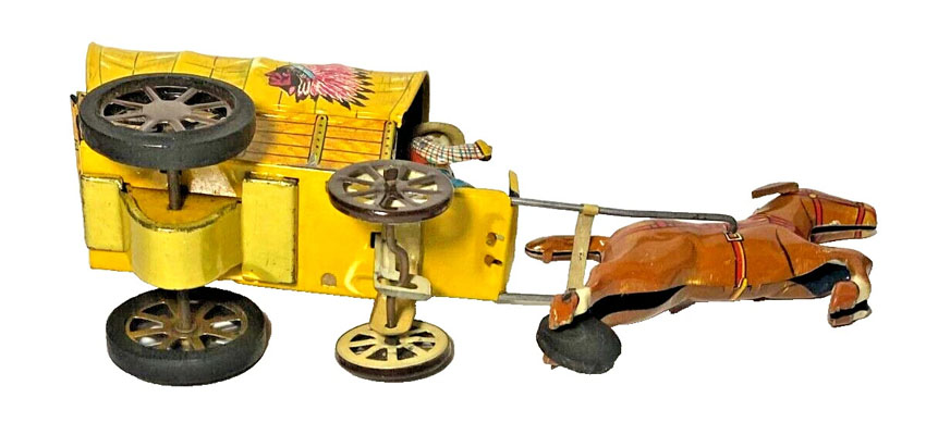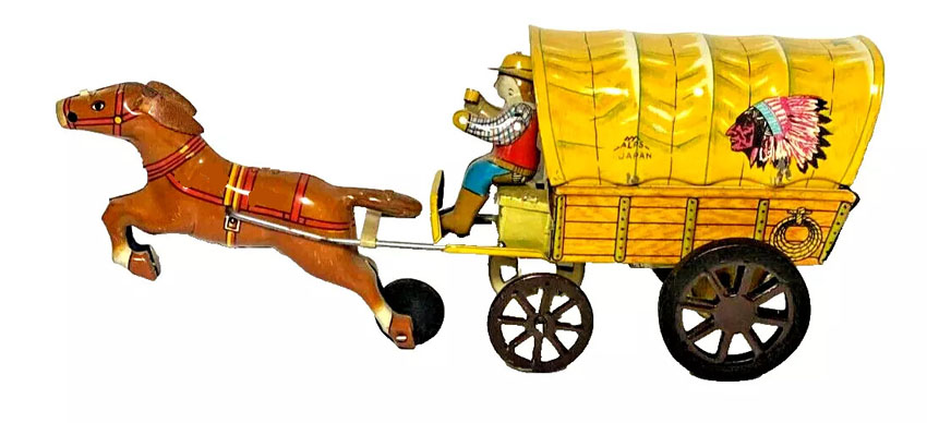 Alps Horse & Covered Wagon, Tin, 9 ½” Long x 3″ wide x 4″ high, Friction, 1950’s