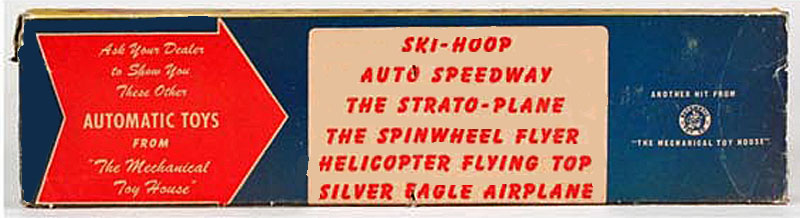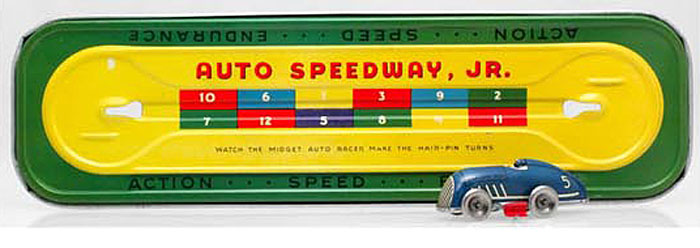 Automatic Toy Co. Auto Speedway, 1934, Tin Litho., Speedway 12¾” – Race Car 3¾” long. Featured two racer cars making hairpin turns around an embossed steel litho base. The first to cross the line after a specific number of turns is the winner.