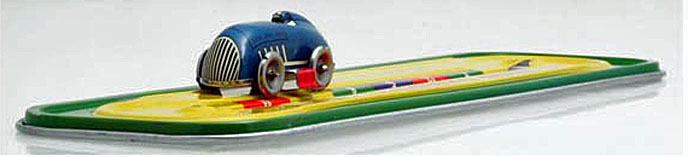 Manufacturer: Automatic Toy Co. Year: 1934 Category: Race Set Material: Tin Litho. Powered: Clockwork Size: Speedway 12¾" - Race Car 3¾" long