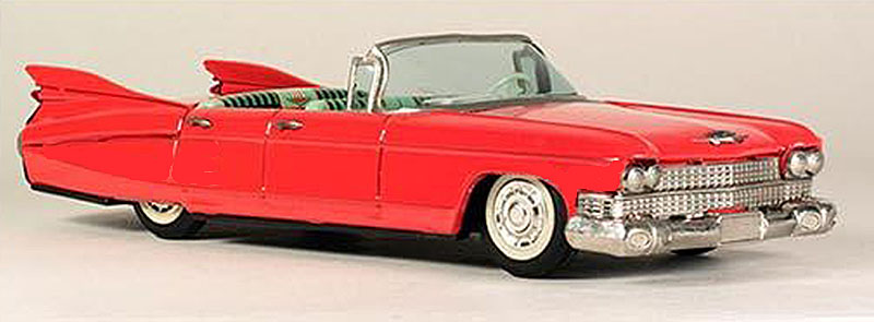 Bandai Cadillac Convertible 4279, Battery Operated, Tin Litho., 12″ long, Car runs in two speed by shifting gears, Forward and reverse. Horn Honks. Motor roar. Steerable front wheels.
