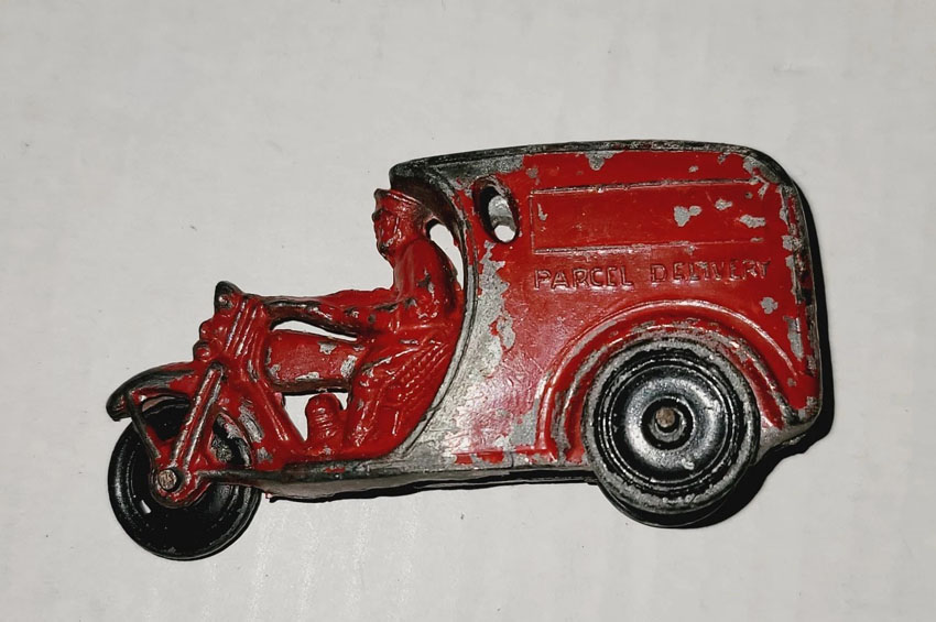 Barclay Parcel Delivery Motorcycle No. 45, Slush Cast, 3-⅝” long, 1931