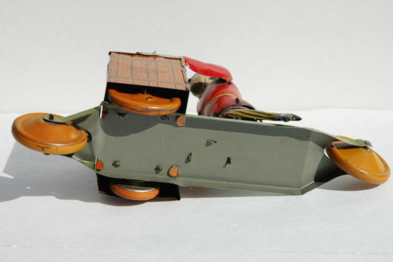 Manufacturer: Behrend & Rothschild B&R Year: 1930's Category: Scooter Material: Tin Powered: Windup Size: 8 1/2" long x 6 1/2" high