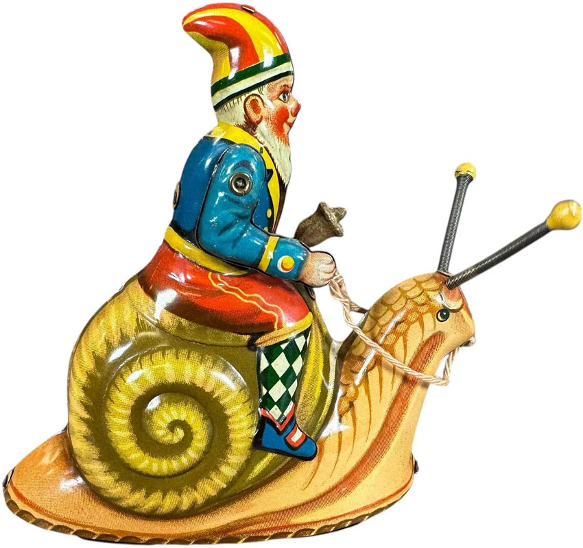 Berkenkamp & Schleuter (B&S) Gnome on Snail, Windup, 5″ long, Tin