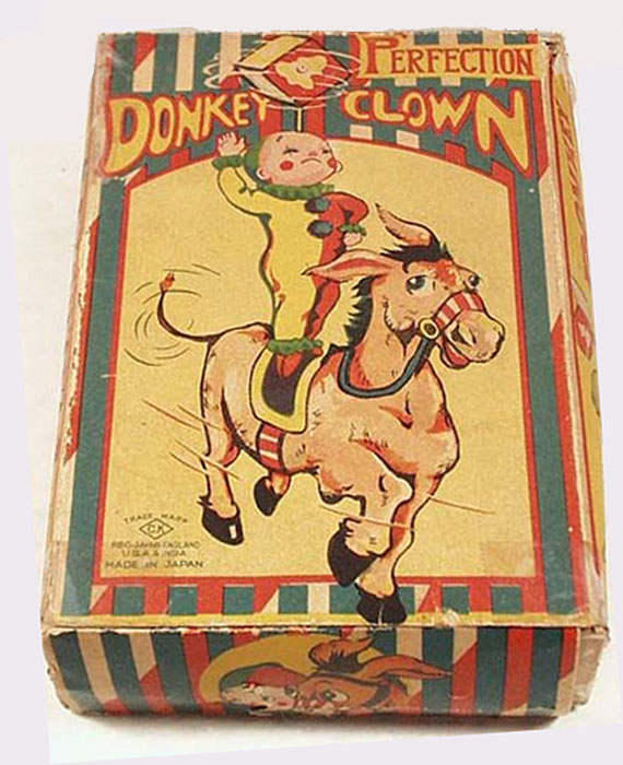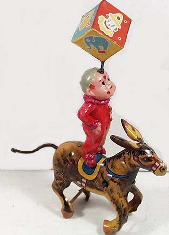 Kuramochi CK Circus Clown on Donkey & Twirling Cube, Windup, Tin Litho.