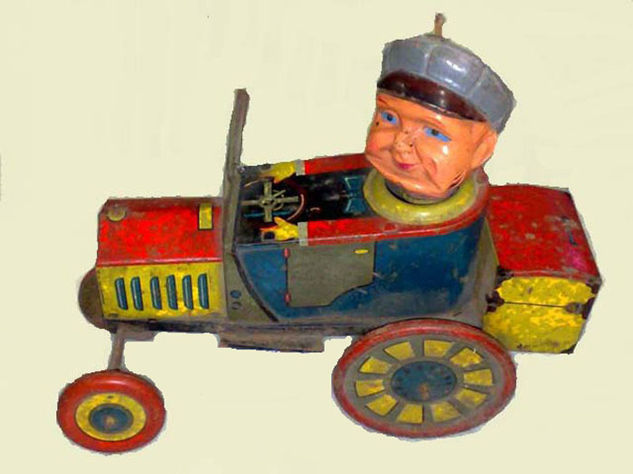 Kuramochi CK Cop Crazy Car Toy, Celluloid/Tin, Windup, 1920’s, The car moves in a Zig Zag direction & Policeman’s Head moves from side to side.