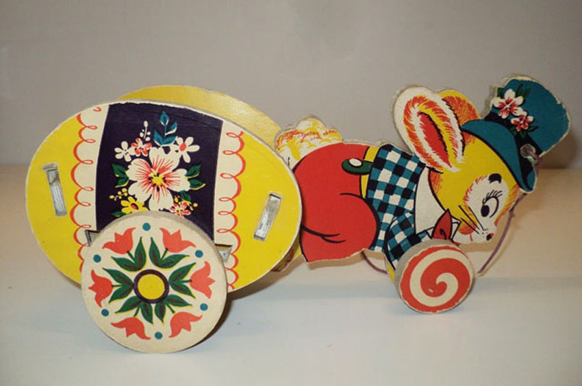 Dolly Toy Co. Easter Bunny Rabbit Cart, Wood, Pull Toy, 1950’s