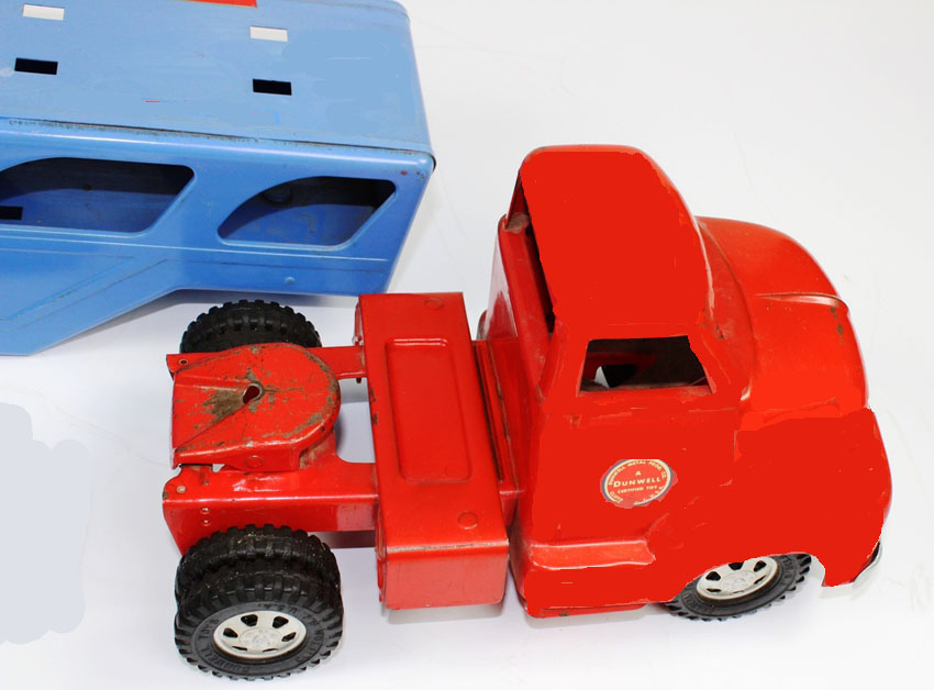Dunwell Tractor Trailer Car Hauler Truck, Pressed Steel, 25″ long x 6″ wide x 6.25″ High, 1950’s