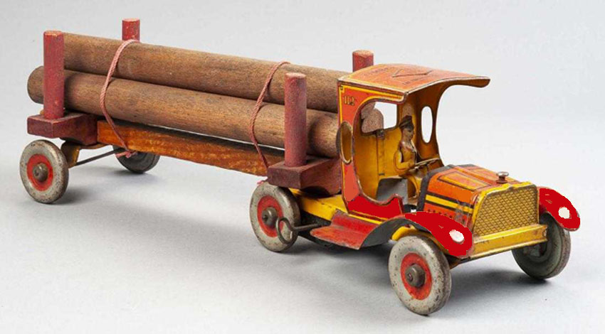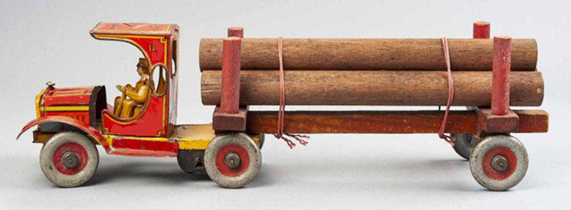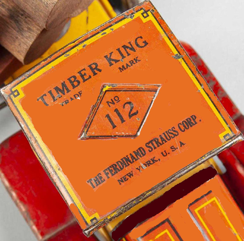 Strauss Timber King Truck No. 112, 18″ long x 5-1/4″ wide x 5-1/2″ high, Tin Litho., 1930’s