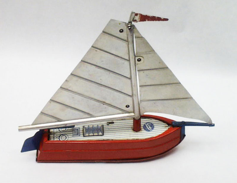 Gescha Sail Boat Toy, Clockwork, Tin, 9.85″ long, 1950’s, Floor Toy