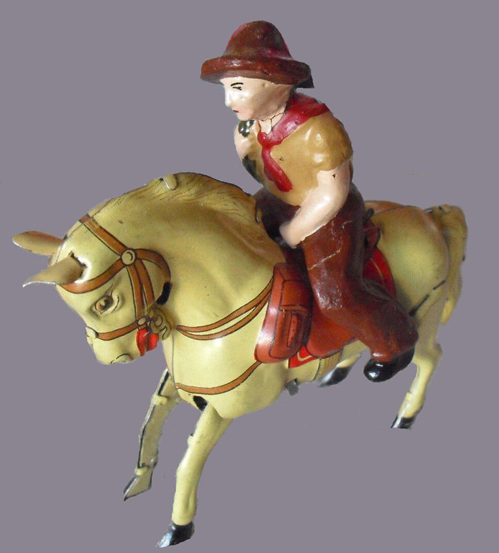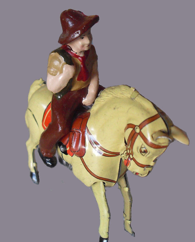 Kohler (GNK) Cowboy on Horse Toy, Windup, 3-15/16″ long, Tin Litho., 1946-52