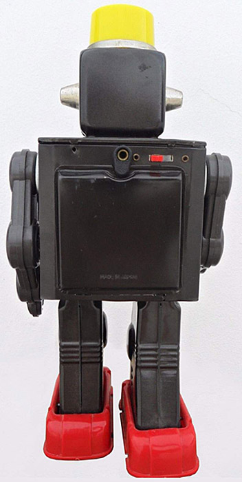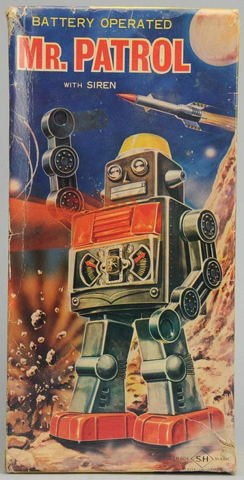 Horikawa SH Mr. Patrol Robot, Battery Operated, 11.5″ tall, Tin, 1960’s When walking along the arms raise up and light starts flashing behind the the red plastic chest panel, a siren noise which varies in pitch as the arms go up and down then resumes normal walking action. Also the gauges in the chest move up and down.
