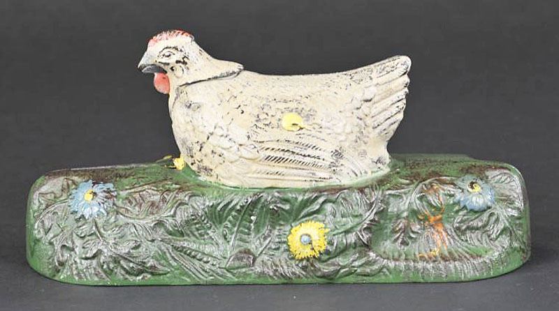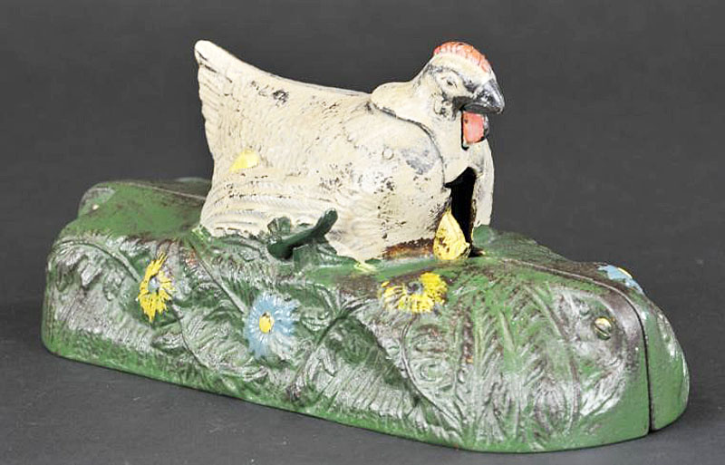 J. & E. Stevens White Hen Sitting on Nest Bank, Spring Action, 10″ Long, Cast Iron, 1901, Place a coin in slot in front of hen. Raise the lever, and as the hen calls, the chicken springs from under her and takes the coin,