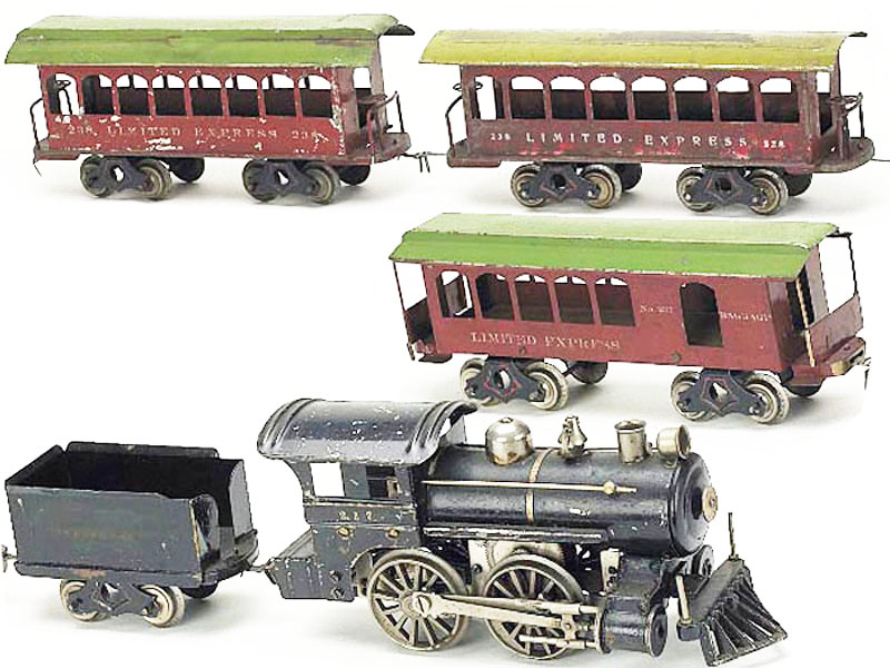 Knapp Passenger Train Set #217 locomotive with nickel stack, bell & dome, “Pennsylvania” tender, #237 “Limited Express Baggage” car, 2 # 238 “Limited Express