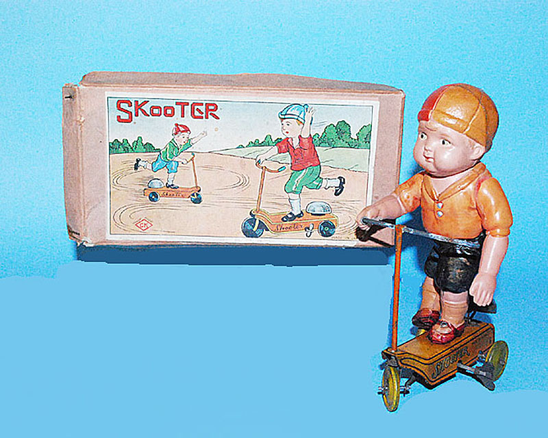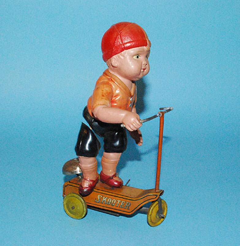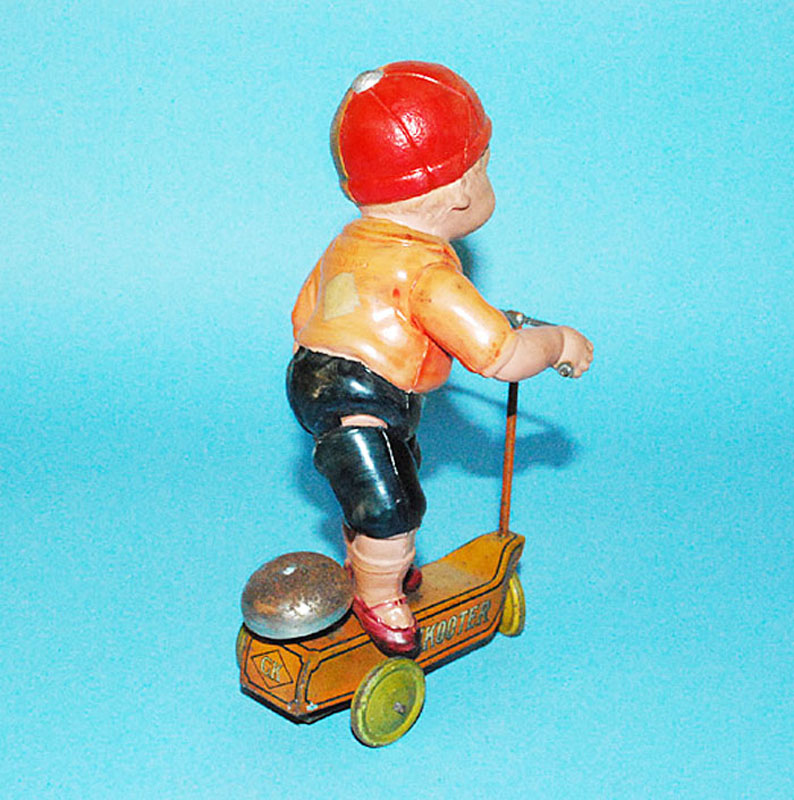 Kuramochi CK Boy on Scooter, Windup, 7″ high, Tin/Celluloid