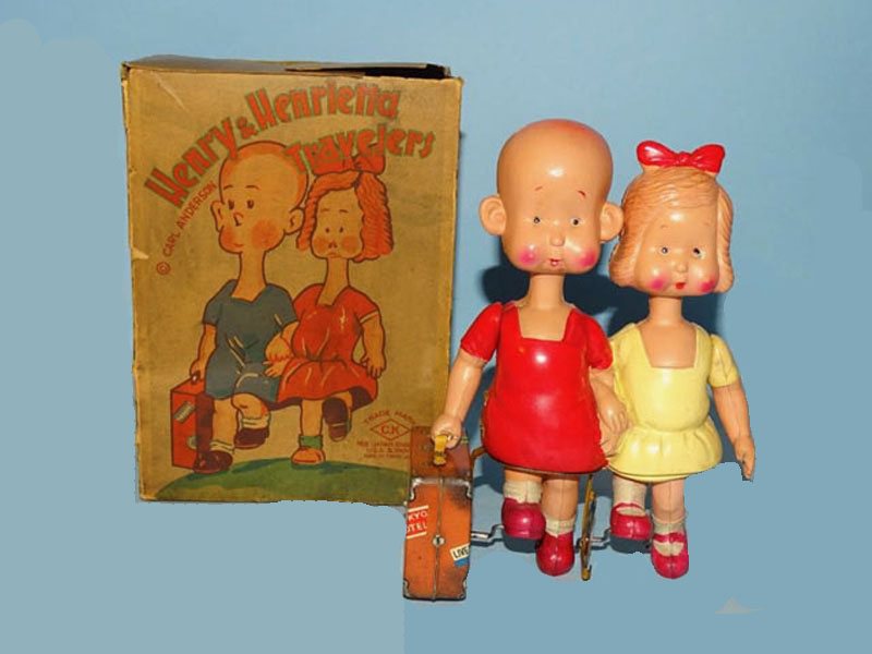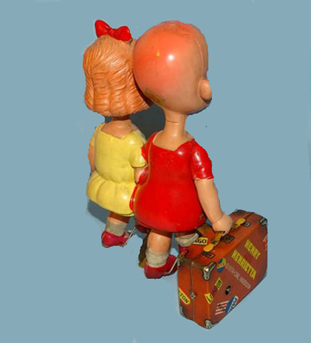 Kuramochi CK Henry and Henrietta Travelers, Windup, 7.25″ Tall, Tin/Celluloid