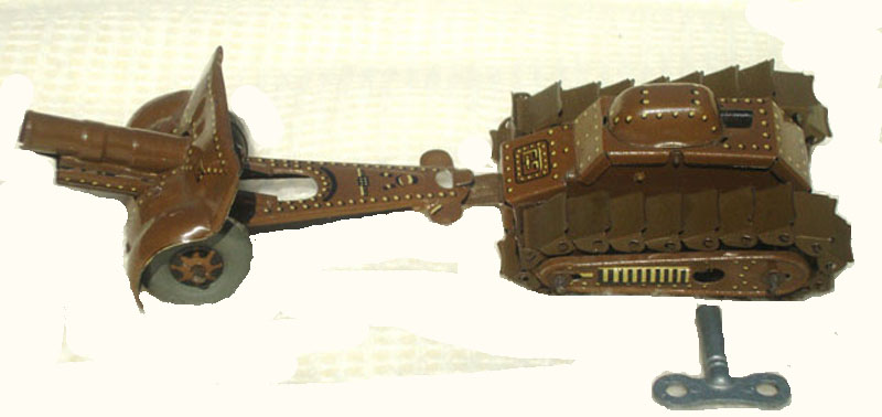 Kuramochi CK Imperial Army Battle Tank & Cannon Toy, Tin, Windup, 3 1/2″ long x 2 5/8″ wide x 1 5/8″ high, 1936