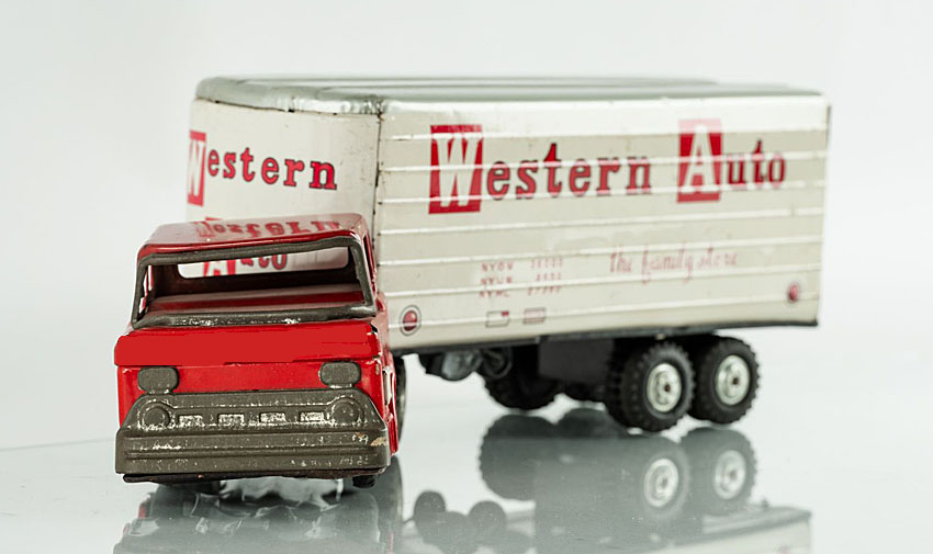 Line Mar Western Auto Truck, Tin, 12.5″ long x 3.5″ wide x 4.25″ high, 1950’s