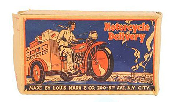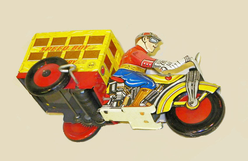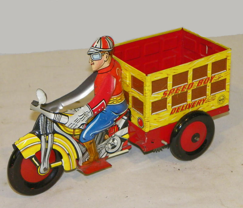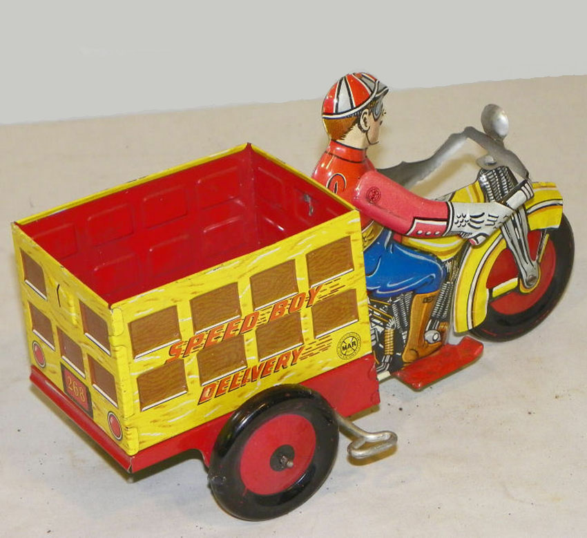 Marx Speed Boy Motorcycle Delivery Cart, Windup, Tin Litho., 1930’s. The toy has a bright litho engine and a large bin on the back. The boy is colored a bright litho. red/blue. On the side of the cycle is marked Speed Boy 4 and the bin is marked Speed Boy Delivery.