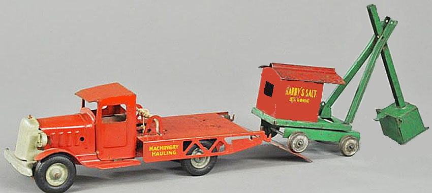 Metalcraft Machinery Hauler with Hardy’s Salt Steam Shovel, Pressed Steel, 13″ long, 1930’s