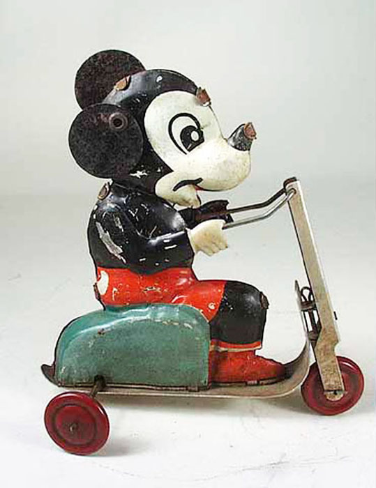 Mickey Mouse on Motor Scooter, 6″ High, Windup, Tin, 1938-40