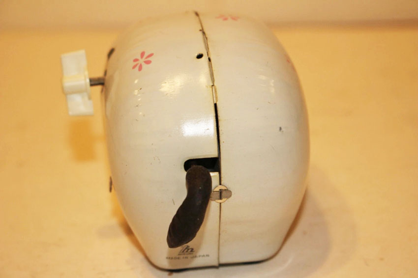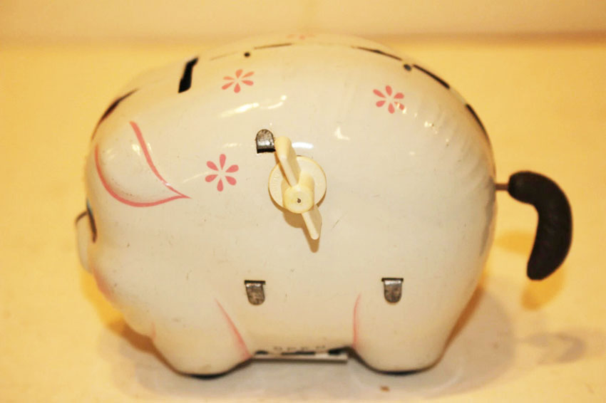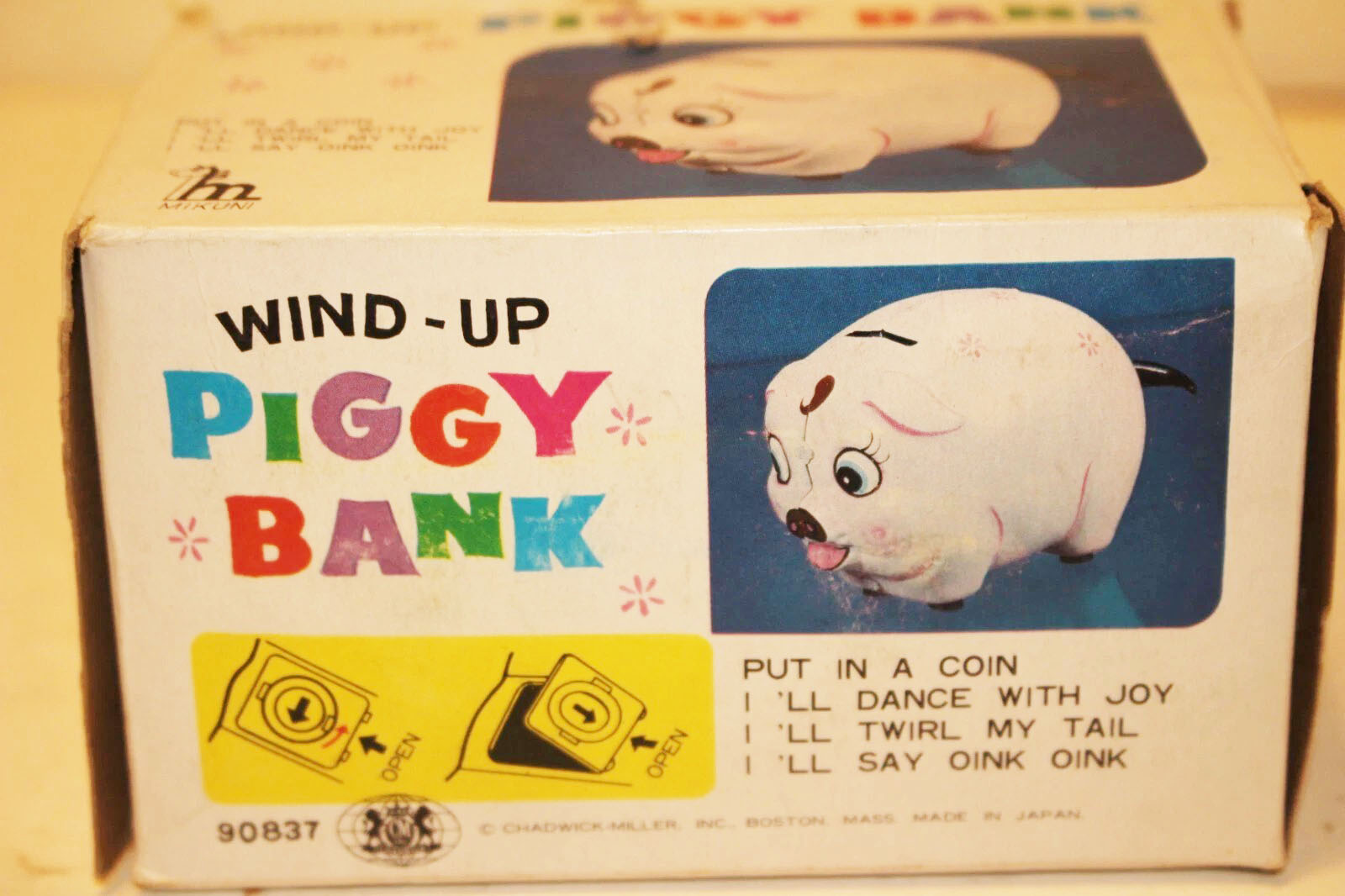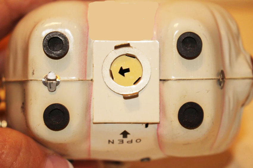 Manufacturer: Mikuni Category: Bank Material: Tin Litho. Powered: Windup Size: 3 1/2" tall x 5" long