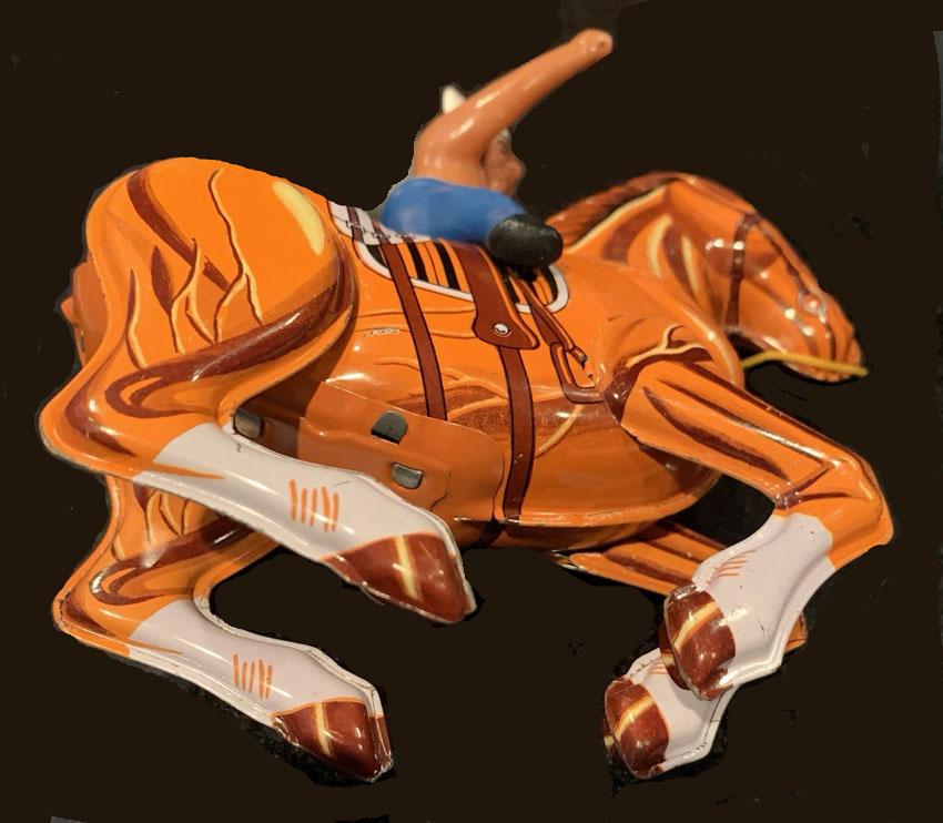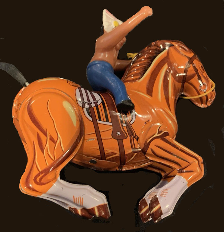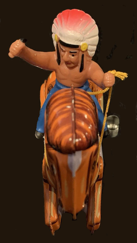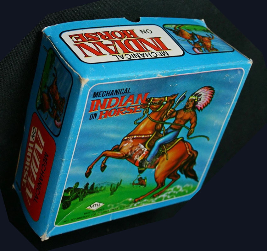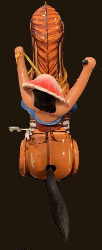 MTU Indian On Horse, Windup, 5″ Long x 5 1/2″ high, Tin/Plastic, 1970’s, Korea