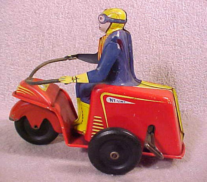 Manufacturer: Ny-lint Year: 1948 Category: Motorcycle Material: Tin Powered: Windup Size: 5-1/4" high x 6-1/2" long