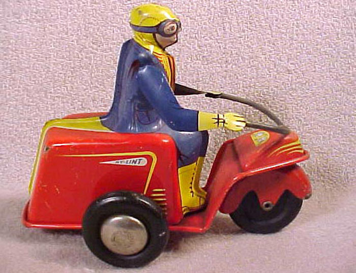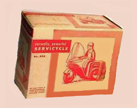 Ny-lint Servicycle Delivery Motorcycle, 5-1/4″ high x 6-1/2″ long, Windup,¶Tin, 1948