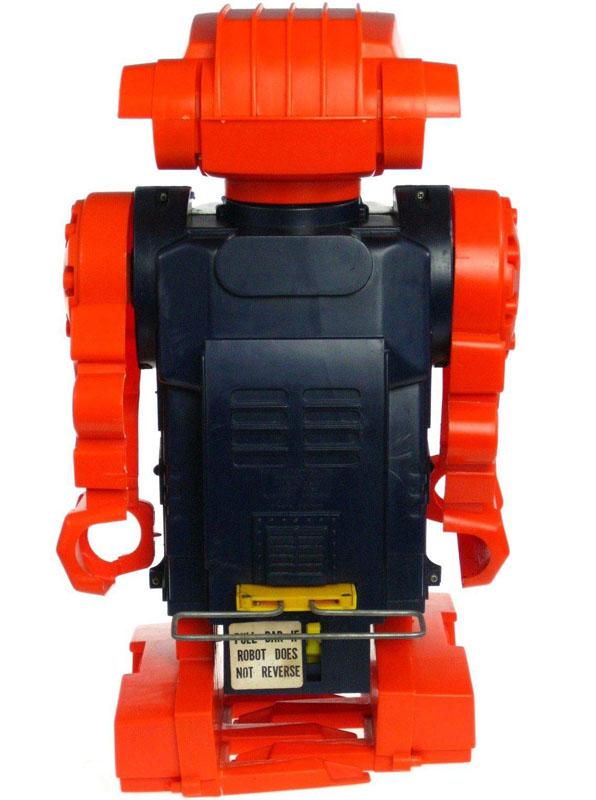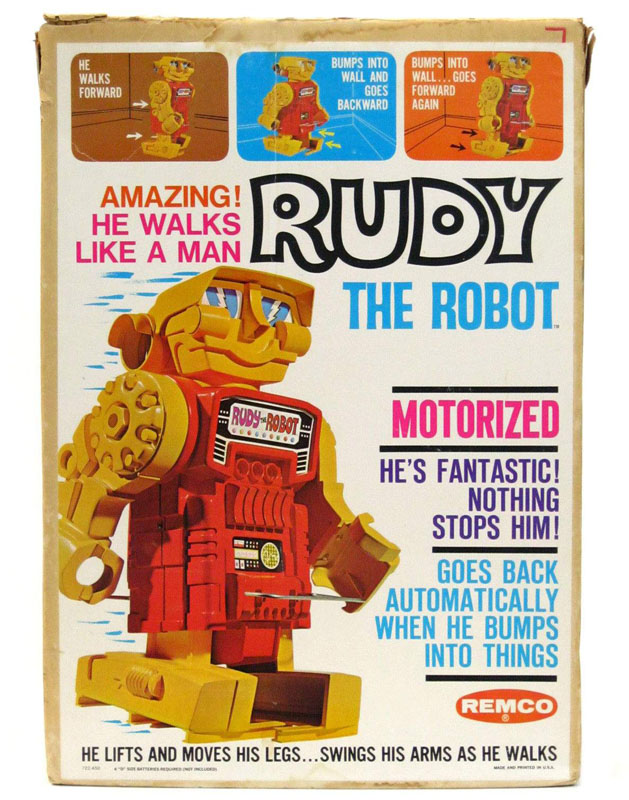 Remco Rudy the Robot, Battery Operated, 17″ tall, Plastic, 1960’s He has a bar on the front and rear that when he hit a wall, he would change his direction. It has bump and go movement, moving legs and flashing lights