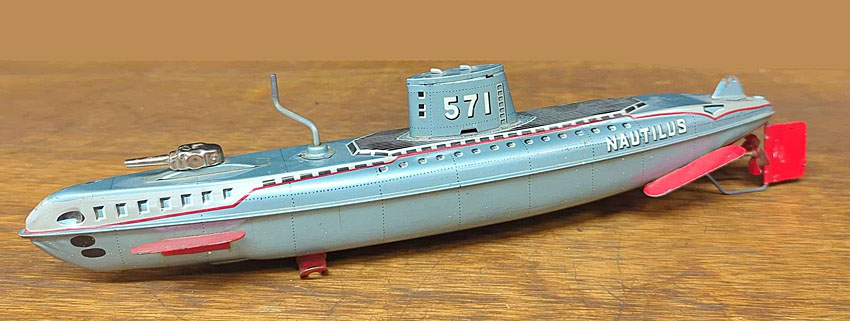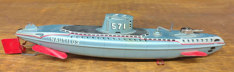 S.K.K Nautilus Submarine, Crank Powered, Tin, 15″ long, 1950’s