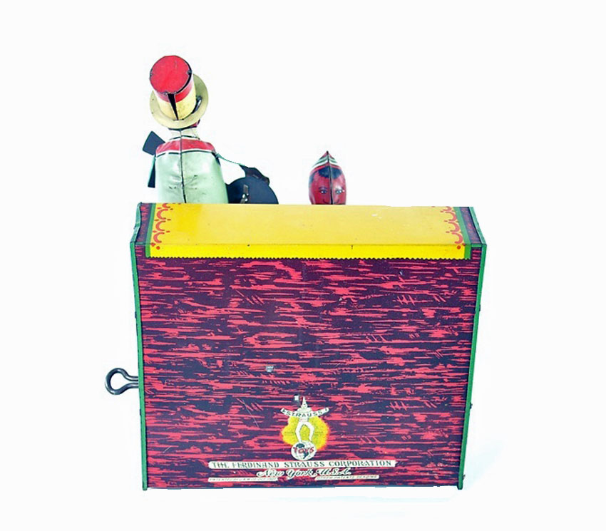 Manufacturer: Strauss Year: 1920's Category: Windup Material: Tin Powered: Windup Size: 7 1/2″ high x 7″ wide x 5″ deep