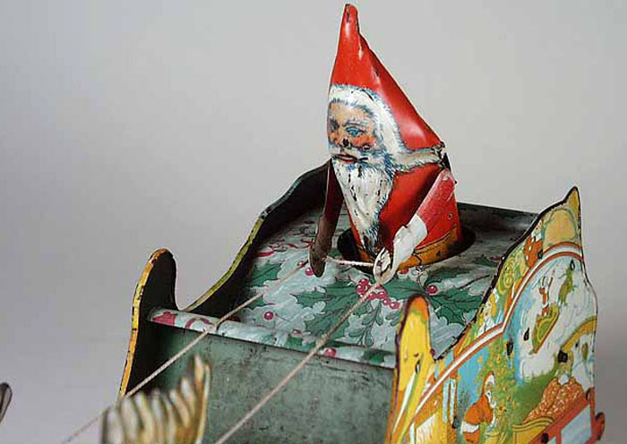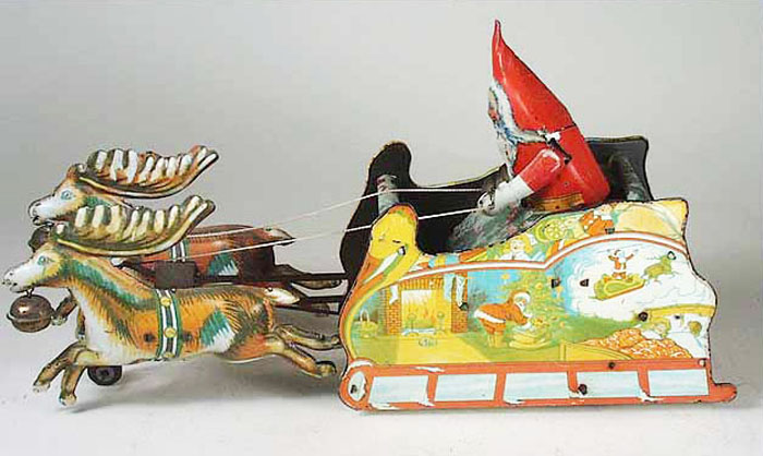 Strauss Santee Claus & Sleigh Toy, Windup, Tin, 11″ Long, 1923