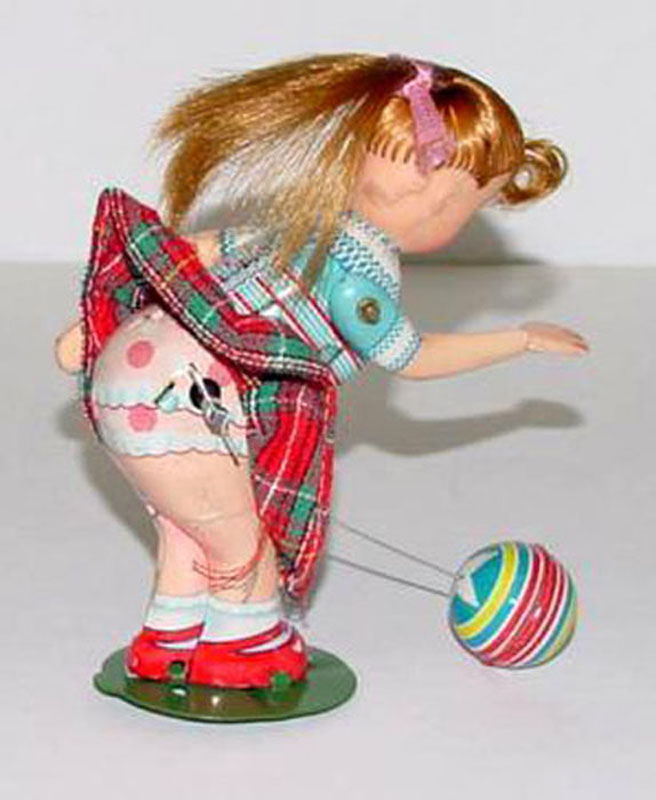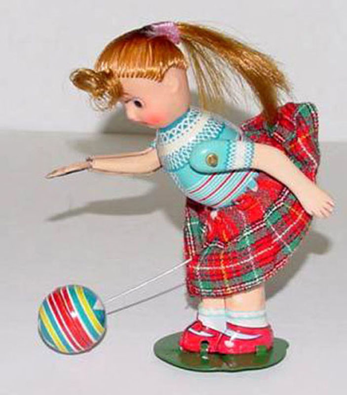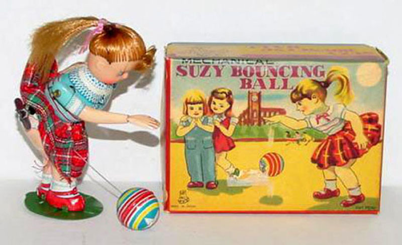 TPS Tokyo Plaything Shokai Suzy Bouncing Ball, windup, 5″ high, Tin Litho., 1950’s
