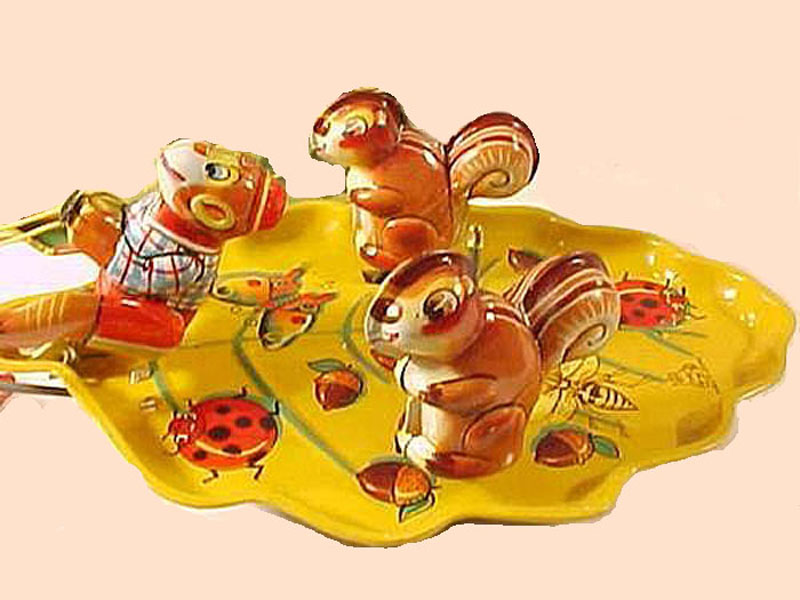 TPS Tokyo Plaything Shokai Wagon Fantasy Land, 12″ Long, 1950’s, Little Monkey with two Squirrels sitting on a leaf being pulled by a Lady Bug