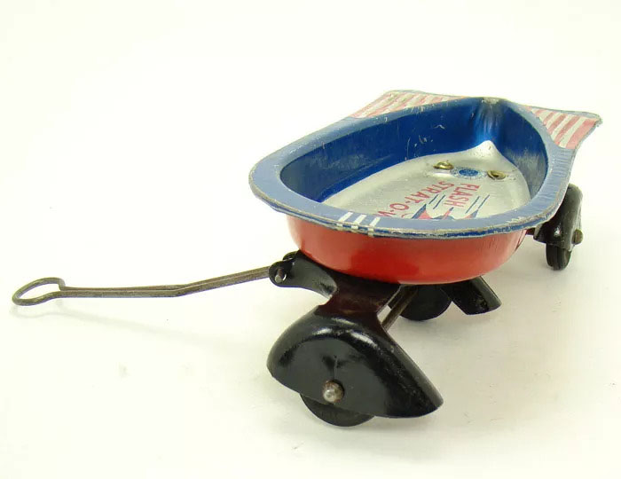 Manufacturer: Wyandotte Year: 1950's Category: Wagon Material: Pressed Steel Powered: Kid Power Size: 9" long with handle x 3" wide x 2" high