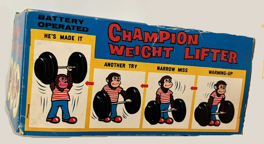 Yanoman Champion Monkey Weight Lifter, Battery Operated, 10″ Tall, Tin/Fur, 1960’s